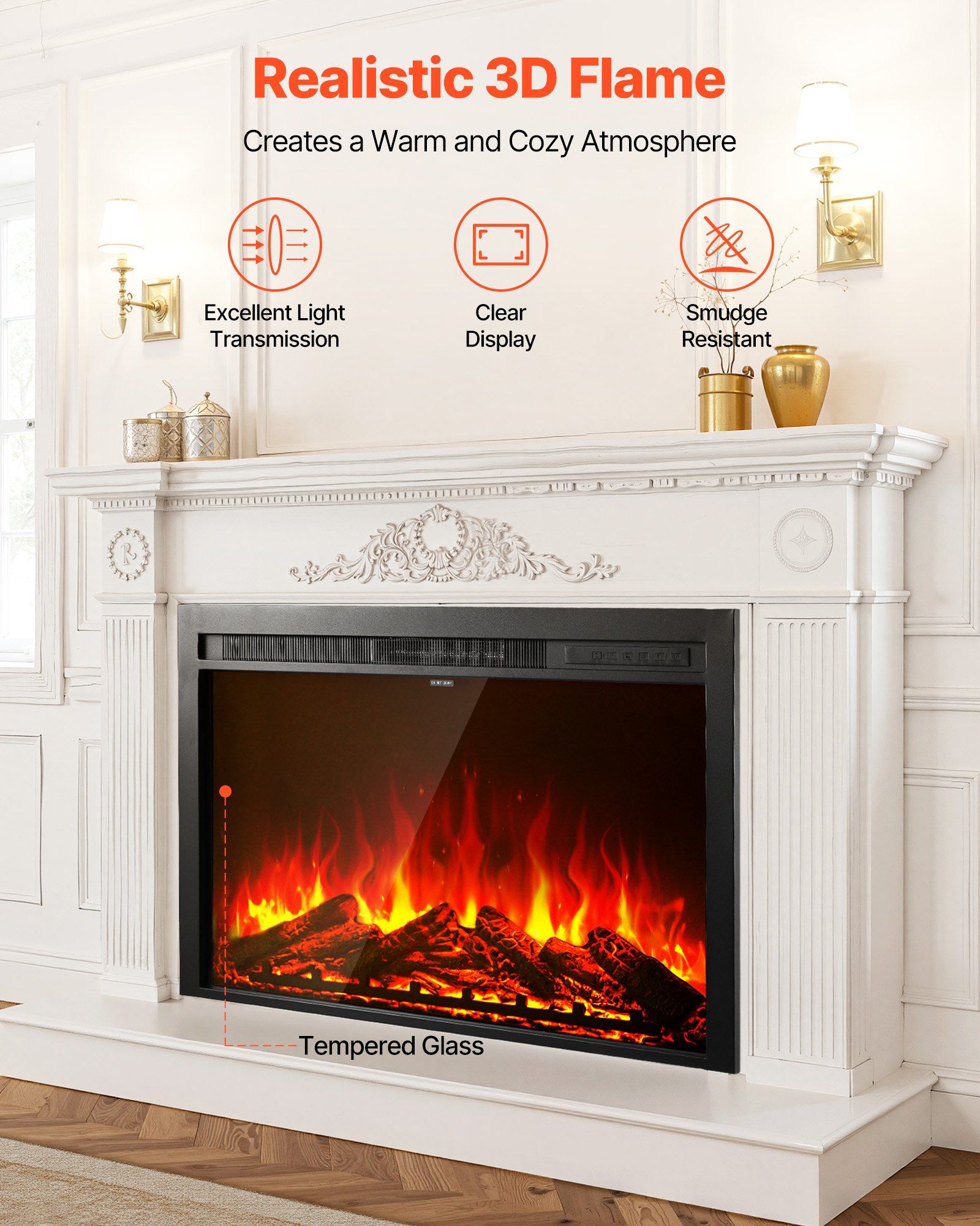 The front screen of this electric fire place is made from high-transparency tempered glass for a clear flame view. It's scratches-resistant and high heat, ensuring long-lasting use and effortless maintenance.