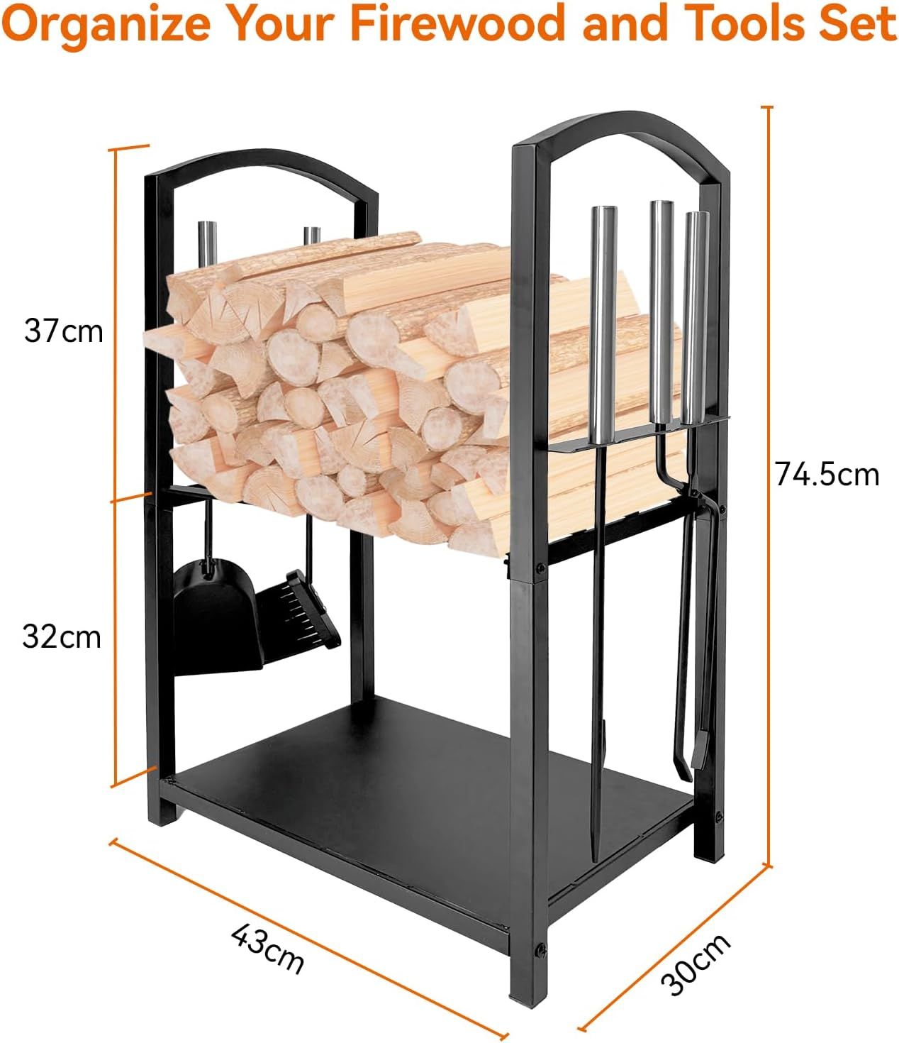 1.LOG STORAGE AND FIREPLACE TOOLS ALL IN ONE This space saving vertical design 2 layer firewood log rack with 4 piece tool in one, which is perfect for your home fireplace, wood stove or outdoor fire pit to store firewood, organize firewood and fireplace tools in cold winter. The four tools are: poker, broom, tongs and shovel.
